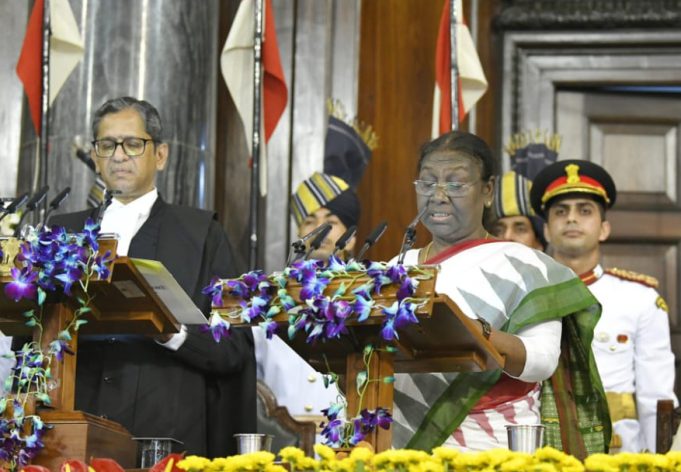 ନୂଆଦିଲ୍ଲୀ: ମୟୂରଭଞ୍ଜ ଜିଲ୍ଲାର ଆଦିବାସୀ ନେତ୍ରୀ ଶ୍ରୀମତି ଦ୍ରୌପଦୀ ମୁର୍ମୁ ସୋମବାର ରାଷ୍ଟ୍ରପତି ଭବନର କେନ୍ଦ୍ରୀୟ ହଲରେ ଦେଶର ୧୫ ତମ ରାଷ୍ଟ୍ରପତି ଭାବରେ ଶପଥ ଗ୍ରହଣ କରିଛନ୍ତି ।