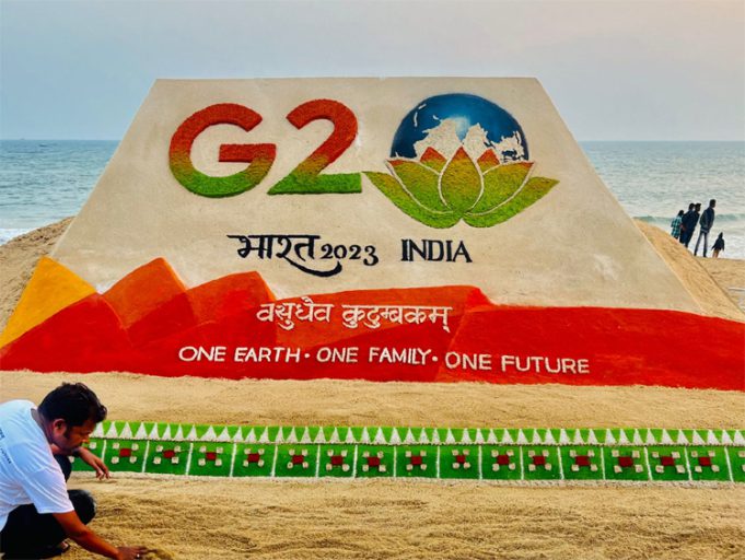 ଭୁବନେଶ୍ୱର : ଗୁରୁବାର ଠାରୁ ଭାରତ ବିଧିବଦ୍ଧ ଭାବେ ଜି୨୦ ଅଧ୍ୟକ୍ଷତା ଗ୍ରହଣ କରିଛି । ଏହି ଅବସରରେ ଦେଶବ୍ୟାପୀ ବିଭିନ୍ନ କାର୍ଯ୍ୟକ୍ରମ ଆୟୋଜିତ ହୋଇଯାଇଛି । କୋଣାର୍କର ଚନ୍ଦ୍ରଭାଗା ବେଳାଭୂମିରେ ଜି୨୦ ଲୋଗୋକୁ ନେଇ ଏକ ବାଲୁକା କଳା ପ୍ରସ୍ତୁତ କରିଛନ୍ତି ବିଶିଷ୍ଟ ବାଲୁକା ଶିଳ୍ପୀ ସୁଦର୍ଶନ ପଟ୍ଟନାୟକ।