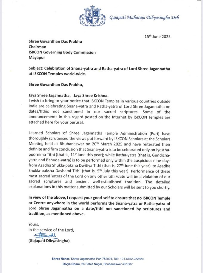 Puri: A significant letter from Gajapati Maharaja Dibyasingha Deb, the venerable Chairman of the Shree Jagannatha Temple Managing Committee, to the Chairman of the ISKCON Governing Body Commission (GBC) Mayapur, Shree Govardhan Das Prabhu has brought to the forefront...