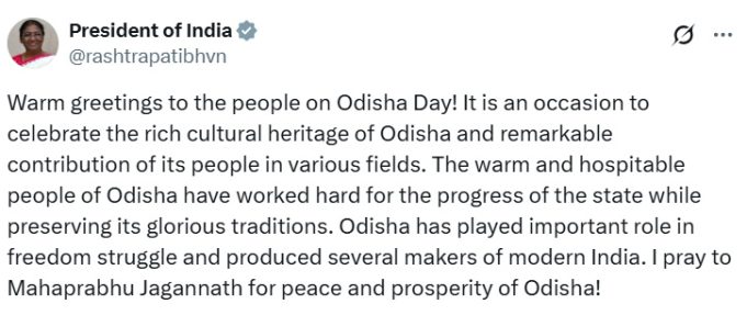Bhubaneswar: President Droupadi Murmu, Prime Minister Narendra Modi and Chief Minister Mohan Charan Majhi extended heartily greetings to the people of Odisha on the occasion of Utkala Dibasa today.
