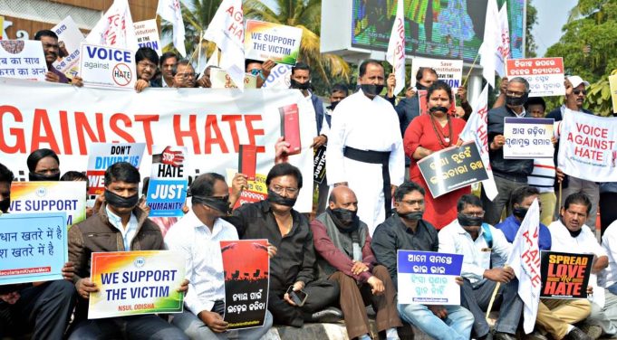 ଭୁବନେଶ୍ୱର : ଓଡ଼ିଶାରେ ସଂଖ୍ୟାଲଘୁଙ୍କ ଉପରେ ହେଉଥିବା ଶୃଙ୍ଖଳିତ ଅତ୍ୟାଚାର ପ୍ରତିବାଦରେ ମାନସ ଚୌଧୁରୀଙ୍କ ନେତୃତ୍ବରେ ଏକ ସାମାଜିକ ସଂଗଠନ 'ଘୃଣା ବିରୁଦ୍ଧରେ ସ୍ୱର' ପକ୍ଷରୁ ଶୁକ୍ରବାର ମାଷ୍ଟରକ୍ୟାଣ୍ଟିନ୍ ଛକରେ ବିକ୍ଷୋଭ ପ୍ରଦର୍ଶନ କରାଯାଇଛି। ବିକ୍ଷୋଭକାରୀମାନେ ମୁହଁରେ କଳାପଟି ପିନ୍ଧିଥିଲେ, ହାତରେ 'ଘୃଣା ବିରୁଦ୍ଧରେ ସ୍ୱର' ଲେଖାଥିବା ପତାକା ଧରିଥିଲେ ।