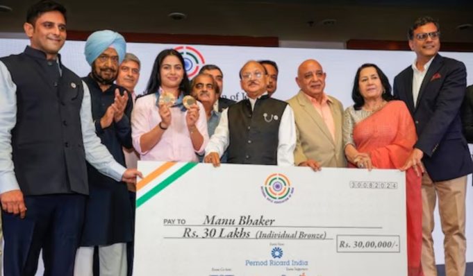 New Delhi:The National Rifle Association of India (NRAI) led by Chief Kalikesh Narayan Singh Deo has felicitated Paris Olympics bronze medallists Manu Bhaker, Swapnil Kusale and Sarabjot Singh during a felicitation programme here on 30 August.